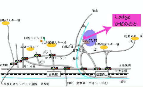 JR白馬駅から車で約5分。「どんぐり村」を目標にお出かけ下さい。