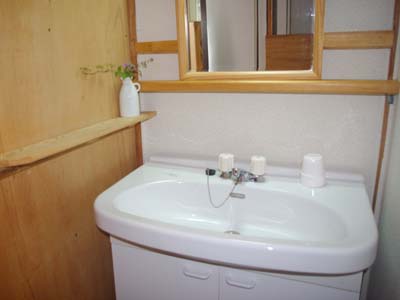 足洗い場は玄関の外扉を開けるとすぐあります。 温水シャワー付きです。 足拭きタオルもご用意しております。 |